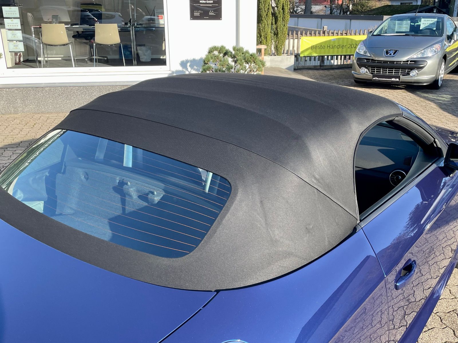 und hat absolut keine Verschleißspuren oder Knickfaltenim Verdeckstoff